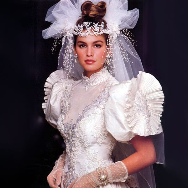 Свадебные наряды 80-х также тяготели к избыточности: роскошные ткани, кружево, блестки и ярко-выраженный акцент на зону декольте, усиленный подплечниками и рукавом кроя «летучая мышь». Именно в 80-е годы XX столетия появились хорошо знакомые нам платья-торты — пышные многослойные наряды, в которых невеста может запросто потеряться.