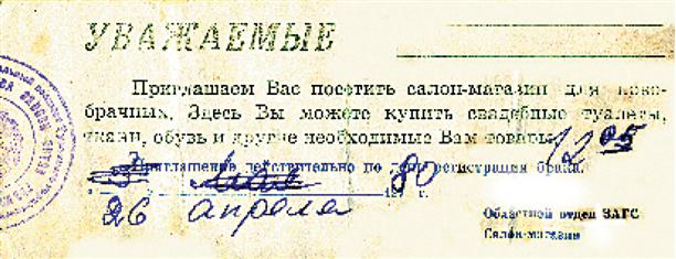 Именно такие приглашения, открывавшие перед потенциальными супругами двери «Салонов для новобрачных», выдавали в загсе при подаче заявления.