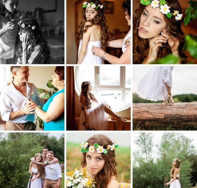 Невесте лучше всего подойдут распущенные пряди, накрученные на большие бигуди или греческая прическа. В волосы обязательно вплетается венок с цветами или отдельно вставляются бутоны, если речь идет о косах. Свадебная прическа должна быть слегка небрежной, растрепанной, напоминать о свободе, грации, женственности. Макияж должен быть не броским, используйте пастельные тона. Выделите самые выразительные черты лица и сохраните умиротворение и улыбку на всю оставшуюся жизнь. Натуральность образа – главное правило make-up в стиле хиппи.