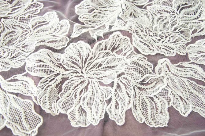 - Узорная вышивка белого цвета. Идеально смотрится на невесомом кружеве. Особенно эффектным, считается вариант создания узора на спине. Глубокий вырез оформляется узором по контуру и заполняется прозрачной тонкой тканью, на которую наносится воздушный и нежный вышитый узор. В этом случае, в передней части наряда должно быть минимальное количество декоративных деталей. Главный плюс – такая вышивка подходит к нарядам любой длины и стилистического направления.