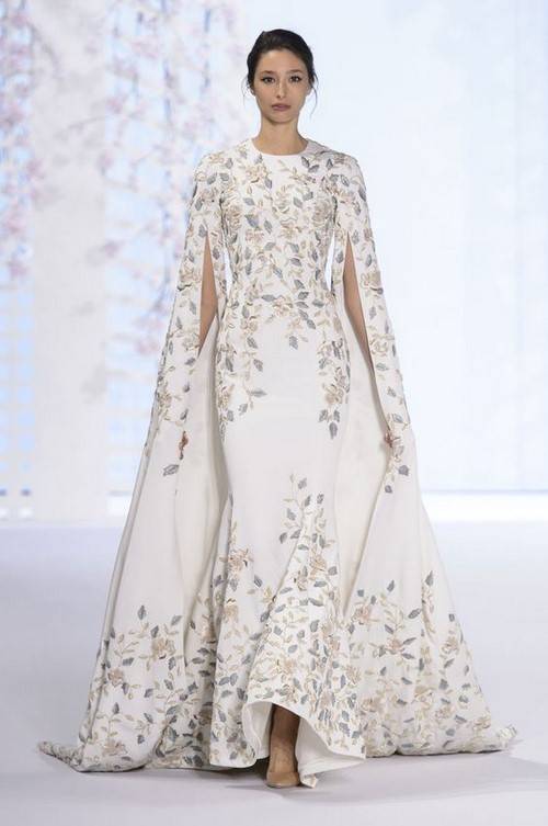Приглянулись многим платья с вышивкой, что дополнены накидками, кейпами, широкими шифоновыми, расшитыми рукавами.