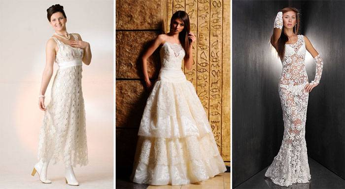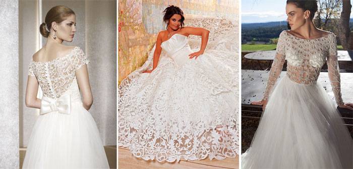 Кружевные модели ручной работы очень практичны, поскольку их вы сможете надевать и после церемонии. Цвет свадебного одеяния не обязательно должен быть белым, допустимо, чтобы он был розовым, голубым или бежевым. Такое торжественное одеяние будет уместно для других праздников в будущем. Кружева делают фигуру более объемной, а значит, заказывать платье такого типа следует только стройным невестам. Пышные девушки, при желании, могут нанять мастера, который вручную декорирует платье небольшими кружевными вставками.