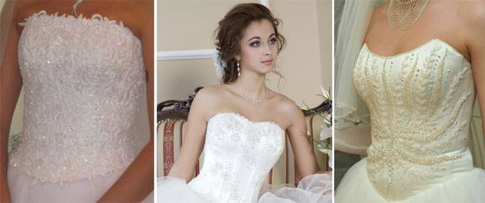 Всемирно известные стразы Сваровски – это самый популярный материал для инкрустации свадебных платьев, сумочек, обуви, заколок для волос, других аксессуаров. Дорогой и сложный декор корсета этими сверкающими камнями подчеркнет неотразимость невесты и очарует всех собравшихся на церемонии гостей. Сколько бы ни прошло времени, и как бы не поменялась мода, стразы на торжественных нарядах остаются одним из главных атрибутов роскоши.