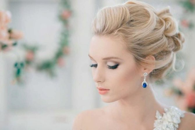 Для создания романтичного образа необходимо собрать хвост, а затем завить концы на мелкие бигуди. Такая укладка гармонирует с начесом в области макушки. Пучок – универсальный вариант высокой прически для свадьбы, он сделает невесту выше и стройнее. Его выполнение лучше доверить профессионалу. Кроме того, пользуются популярностью: