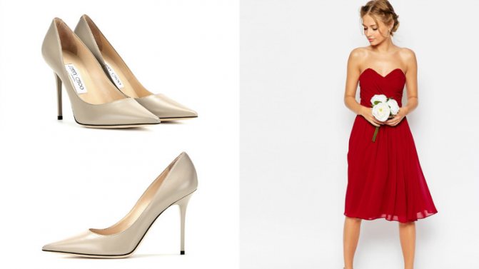 - к лаконичному наряду длиной до колен стоит приобрести туфли на высоком каблуке, имеющие броский декор. Если же платье имеет оригинальный фасон и множество украшений, туфли стоит надеть максимально простые;