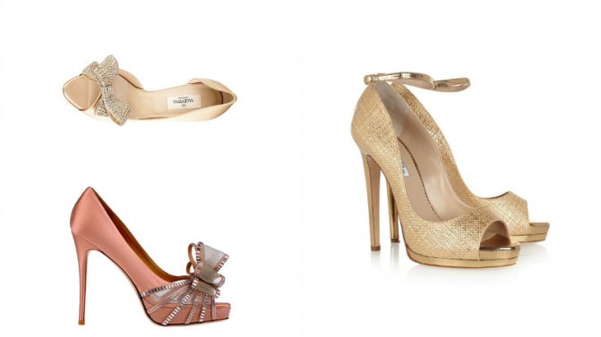А вот модный дом Valentino представил в весенней свадебной коллекции модели цвета айвори с отрытым мыском, стразами, украшающими высокий каблук-шпильку и крупным бантом на передней части туфель.