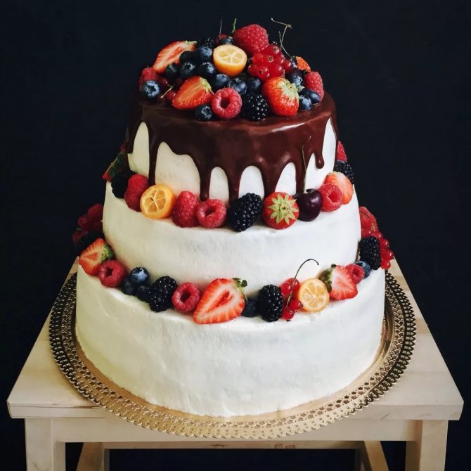 Торт без мастики, политый шоколадом, с фруктами и ягодами