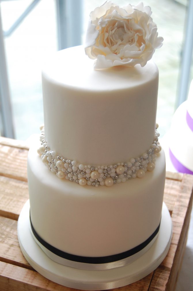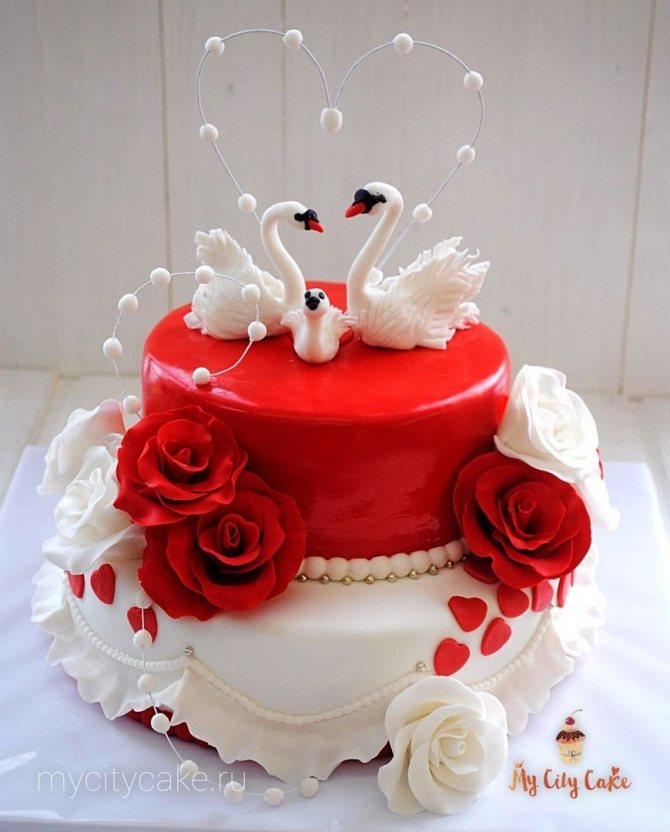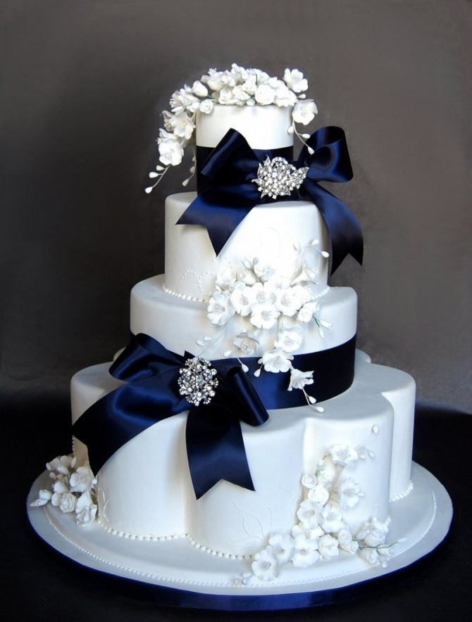 Это классический вариант свадебного лакомства. Украшают его обычно всем, что только придет в голову заказчику: фигурки, цветы, бусинки, ажурные ленты.