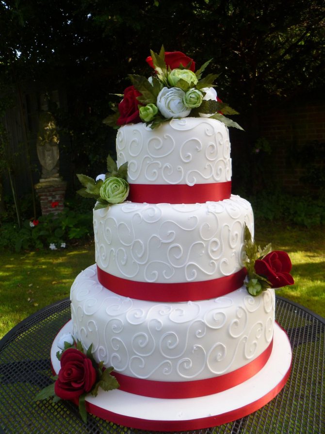 Можно заказать торт без мастики на свадьбу, но это несколько ограничивает возможности его декорирования, так как кондитерская мастика является сегодня одним из самых востребованных материалов для оформления тортов и изготовления украшений для них. Преимущество мастики в том, что благодаря добавлению пищевых красителей ей можно придать любой цвет, так что никого уже не удивляют торты из мастики на свадьбу самых фантазийных расцветок. Еще одно, не менее важное преимущество мастики – ее эластичность, благодаря чему из нее можно изготовить любой, даже самый сложный и тонкий декоративный элемент.