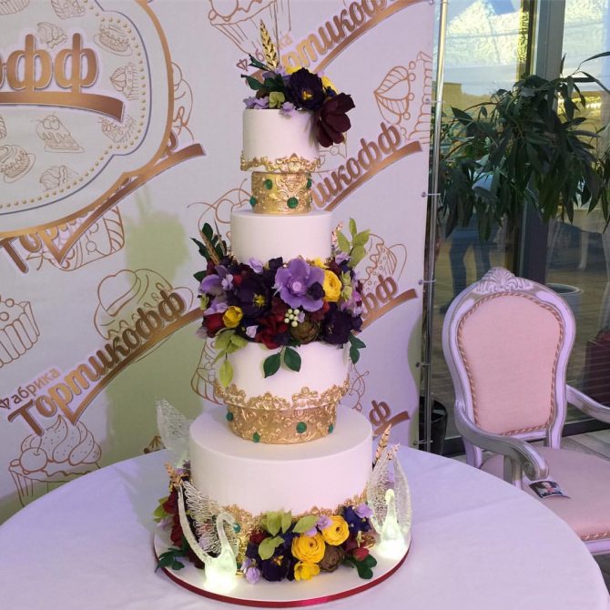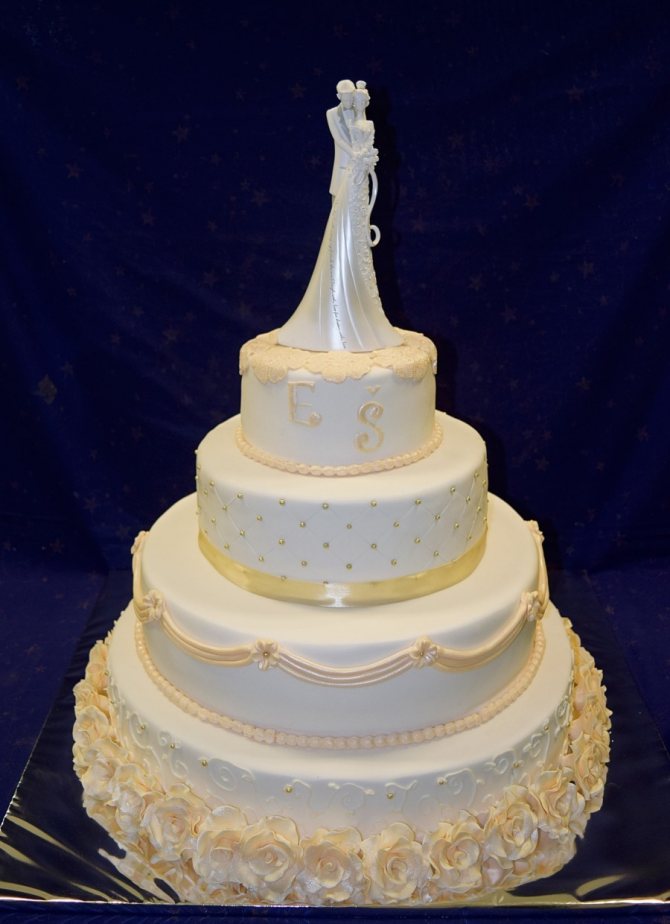 Фото шикарного большого торта на свадьбе с мастичными украшениями