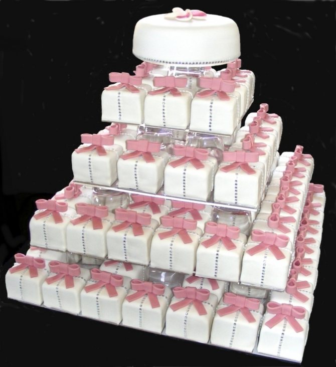 Свадебный торт может быть одно- или много- ярусным, поделенным на порции или полностью состоящим из капкейков (пирожных или кексов).