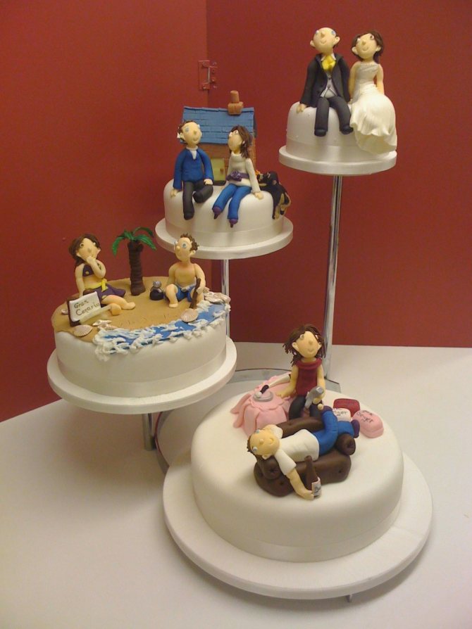 Обычно пары вспоминают историю знакомства и другие знаковые сюжеты развития их отношений. Все это можно отразить на свадебном торте. Фото с оригинальным свадебным тортом запомнится надолго.