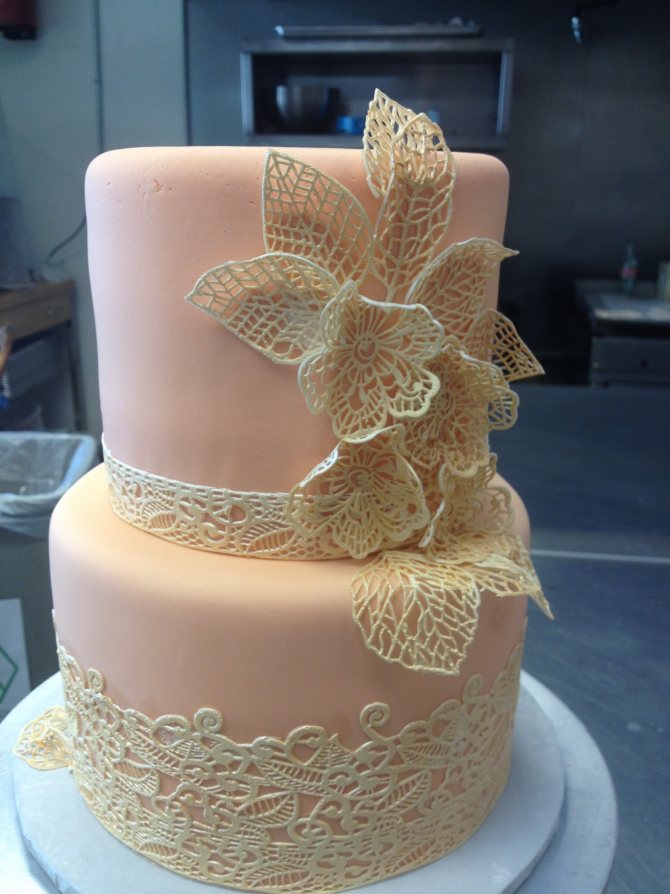 Очень удобной для работы является желатиновая мастика, которая и после застывания сохраняет упругость и твердость, что позволяет вырезать из нее мелкие детали, цветы, буквы и т. п.