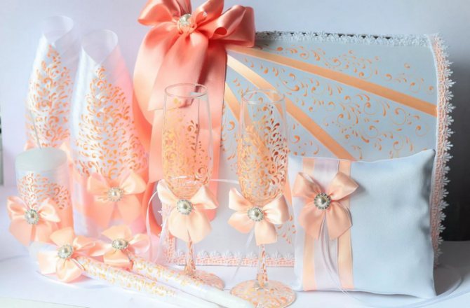 При помощи персикового оттенка можно изначально задать свадебному торжеству романтического настроения