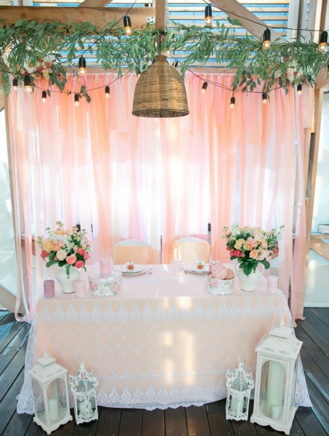 Особое внимание всегда уделяется столу, за которым будут сидеть молодожены. Часто его украшают белой и персиковой вуалью
