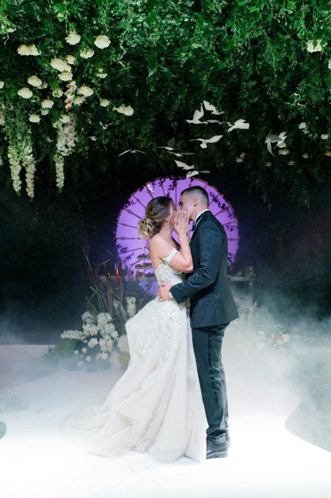 3D-мэппинг на свадьбе – это видеоистория, транслируемая на ваш свадебный торт, детали интерьера или даже свадебное платье! Видеоряд продумывается до секунд, поэтому времени на подготовку нужно значительно больше, чем при использовании другого искусственного освещения.