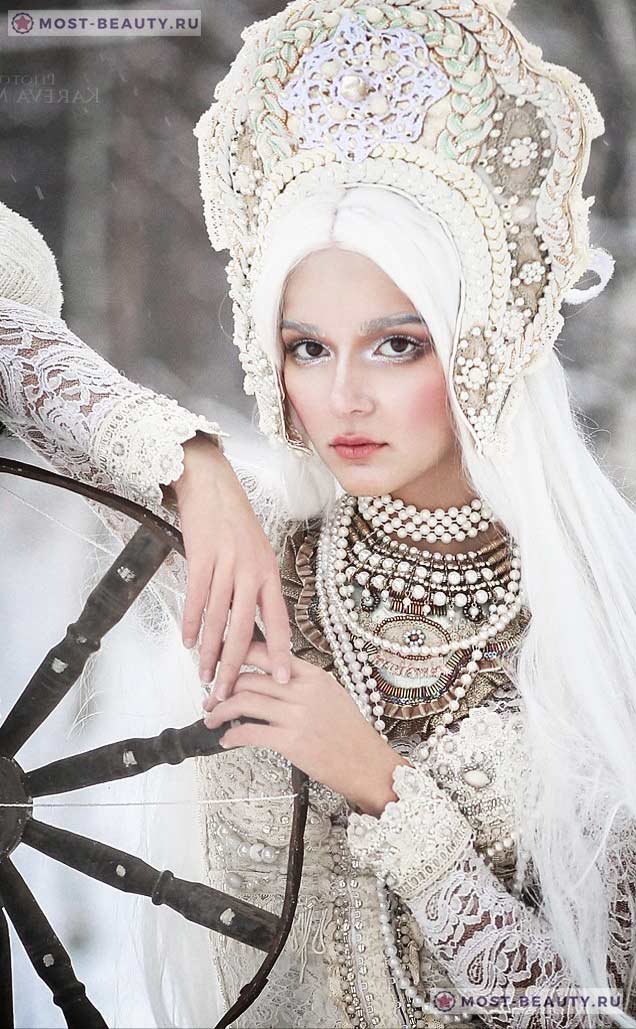 Наиболее свежей тенденцией также является свадебное платье в русском стиле. Это может быть необязательно исконно русский народный наряд: длинное платье с хорошо очерченным лифом, немного напоминающим сарафан, который можно задекорировать как уже полюбившимся кружевом, так и натуральным жемчугом. Но при этом, русская невеста не должна изобиловать декором, образ должен получиться нежным и элегантным. Подходит такой наряд почти для каждой фигуры. А дополнить свой гардероб можно веночком из живых цветов.