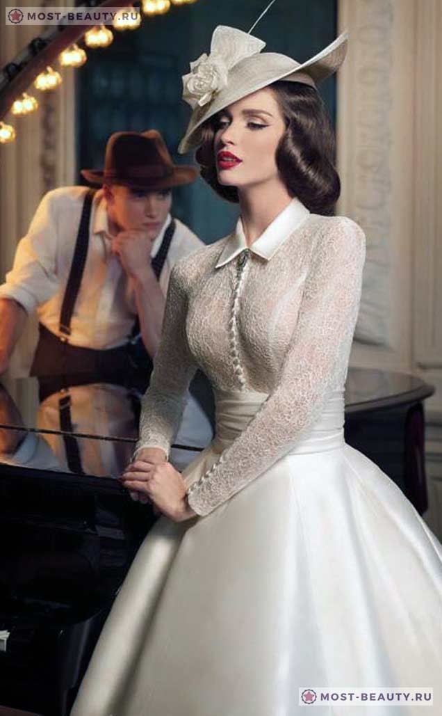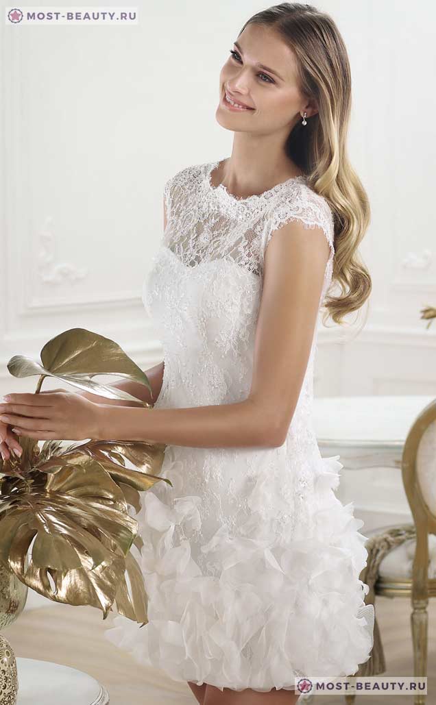 Достойной альтернативой красивым длинным свадебным платьям могут быть короткие модели. Такие платья могут иметь самые разнообразные фасоны: с пышной юбкой, строгой юбкой-карандашом, с асимметричной короткой юбкой, плавно переходящей в шлейф. Для того чтобы невеста выглядела утонченно и элегантно, стоит выбрать длину до середины колена, под такое платье подойдут классические лодочки и украшения из жемчуга. Некоторые более экстравагантные дамы выбирают к короткому платью со шлейфом сапоги, на голову надевают шляпку, что придает красивой девушке эпатажный вид.