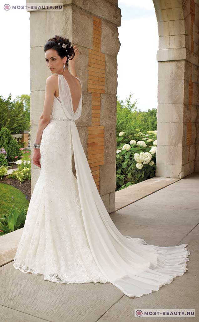 В таком наряде невеста будет ощущать себя настоящей богиней. Благодаря линиям кроя и струящейся ткани, которая отделывается изысканной драпировкой, платье придаст своей обладательнице аристократическую утонченность. Это идеальный пример нестареющей классики и, как говорят, — «на все случаи жизни». В таком одеянии будет комфортно также и беременной невесте, так как в его складках легко можно скрыть своё интересное положение.