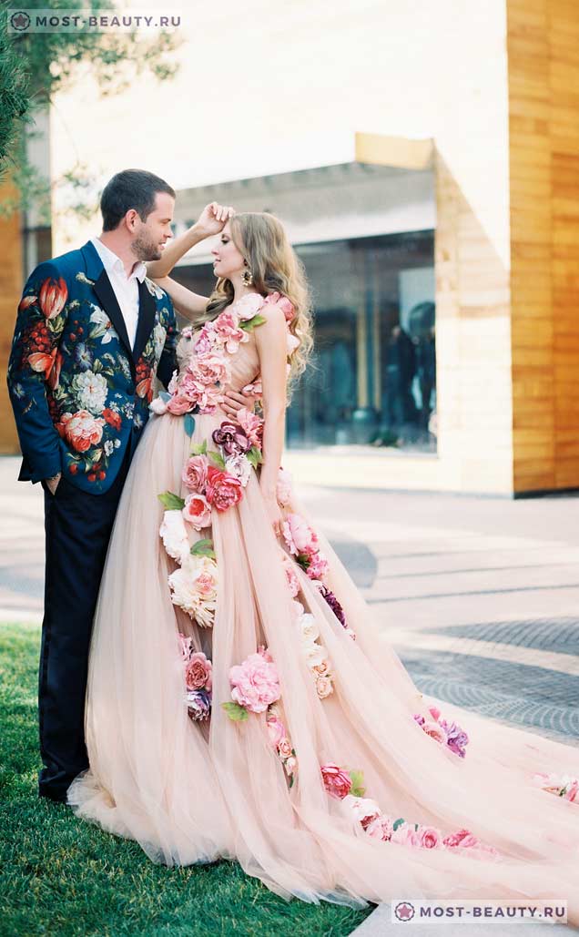 Желая выглядеть не только красиво, но и уникально, невеста может обратить внимание на пышные платья самых разнообразных расцветок. Такой гардероб выделит из общей толпы «белоснежных» невест. Достоинства цветного платья очевидны, цвет можно подобрать под тон кожи, цвет глаз и наиболее выгодно их подчеркнуть. Платье будет стоить в разы дешевле белого. Цветное платье можно будет потом надеть и на другие праздники! Такой наряд может надеть на себя невеста, которая выходит замуж уже не впервые и это будет наиболее уместно на ее торжестве.
