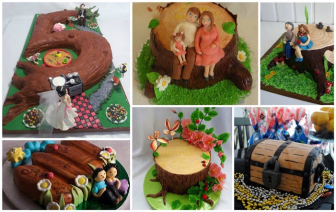 - Годовщина пяти лет совместной супружеской жизни – это юбилей, именуемый деревянной свадьбой. Дерево – это символ, который говорит о прочности союза супругов, который стал таким крепким, что приобрел твердость и вечность упомянутого природного материала. В данном случае нетрудно изобразить торт в виде деревянного сундука с парой влюбленных мужа и жены. Украшайте кондитерское изделие цифрой пять, используйте цветы из сахара или мастики, съедобные жемчужные бусы из конфет и другие декоративные элементы.
