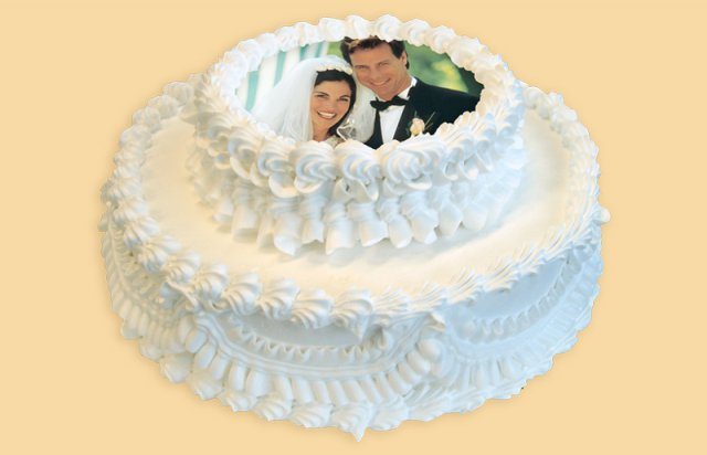 - Найдите все фотографии ваших родителей со свадьбы. Отберите несколько трогательных моментов (например, роспись в ЗАГСе, надевание колец и т.п.), используйте их для украшения торта. Пусть это будет огромный торт в один-два невысоких коржа, где будет воспроизведена выбранная фотография по всему периметру. Чем больше окажется данный торт, тем зрелищнее это будет смотреться.
