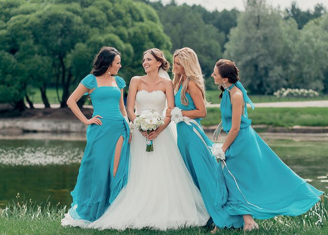 Если же будущая жена надела платье цвета бирюза, то подружкам лучше выбрать наряды светло-розового, кремового, кораллового, голубого и иного нежного тона.