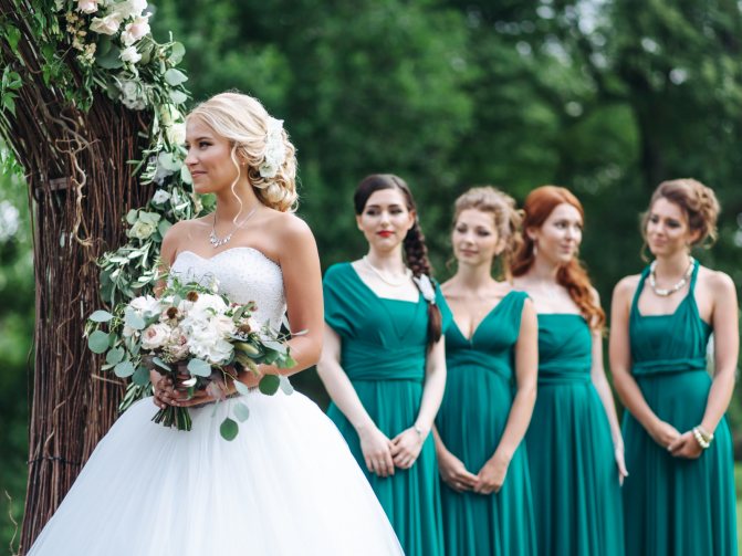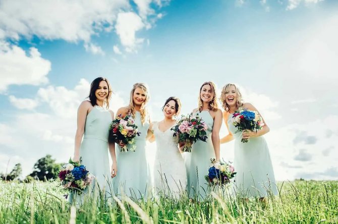 Приглашенным девушкам не следует надевать платья в тон с нарядом невесты.