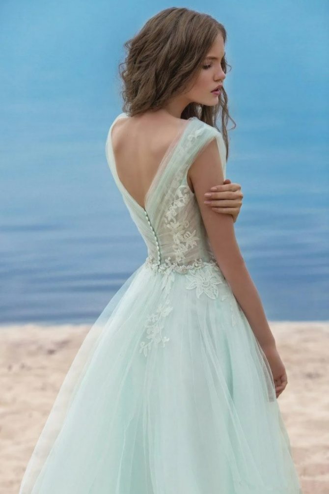 Можно не однотонное, а с плавным переходом, к примеру, от белого к бирюзе. Украшения не нужно подбирать в тон с нарядом. Если платье белое, серьги, колье или диадему лучше выбрать лазурной, голубой расцветки.