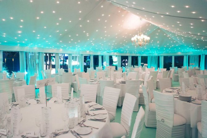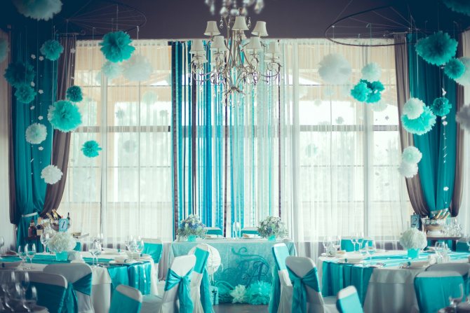 Стены зала для свадьбы будут выглядеть шикарно, если сделать их в бирюзовом, зеленом и голубом цветах. Такие оттенки мягко переходят друг в друга, визуально расширяя пространство, и не напрягают глаз, не утомляют гостей.