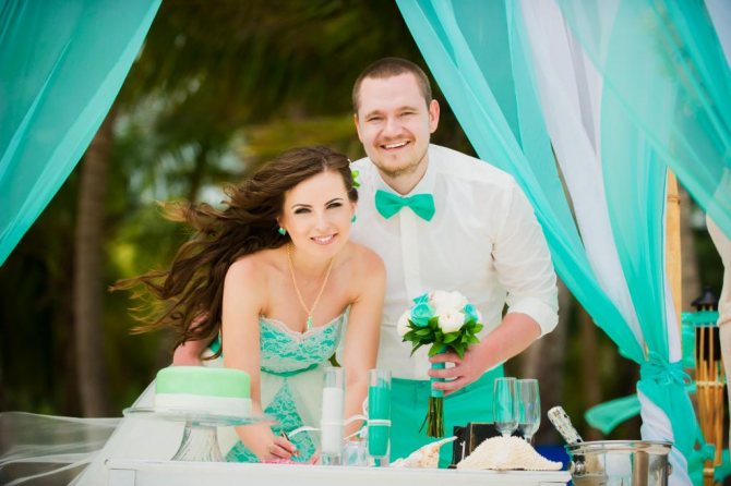 Важно, чтобы наряды молодоженов и гостей гармонично вписывались в главный бирюзовый цвет свадьбы.