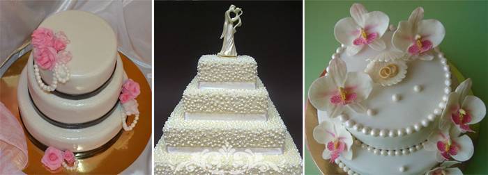 Вы склонны к самостоятельному приготовлению свадебного торта? Тогда жевательный зефир «Маршмеллоу» – незаменимый помощник. Для приготовления мастики вам понадобится желатин, сухое молоко, белый или черный шоколад и зефир. Смешав все ингредиенты, вы получите различные формы украшений, в т.ч. и жемчуга. Экспериментируйте, добавив масло в рецепт торта. Скатав в правильную форму мастику, стоит чуть-чуть подождать. Для блеска жемчужин используйте кандурин (сухой порошок). Кистью покройте поверхность украшений, и у вас на столе будет шикарный торт с блеском!