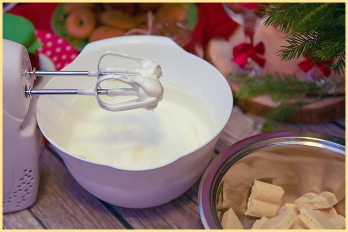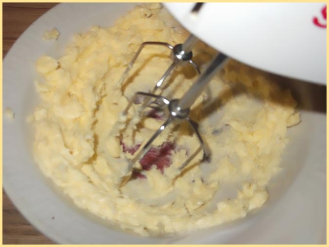 - Для крема взбить 200 г мягкого масла со сгущенкой. Переложить в кондитерский мешок.