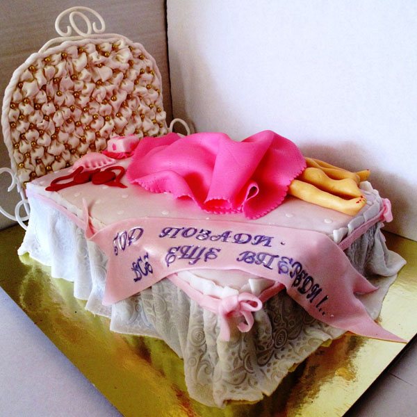 Через 1 год после свадьбы отмечают ситцевую годовщину, поэтому в дизайне торта на этот праздник можно использовать имитацию ситцевых вещей, например, это могут быть молодожены на кровати, застеленной ситцевым бельем! Такое необычное лакомство можно даже использовать для стилизованной фотосессии на годовщину свадьбы. Если такой смелый вариант вам не походит, то можете сделать торт на ситцевую свадьбу в виде лоскутков разноцветной ткани.