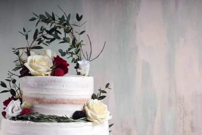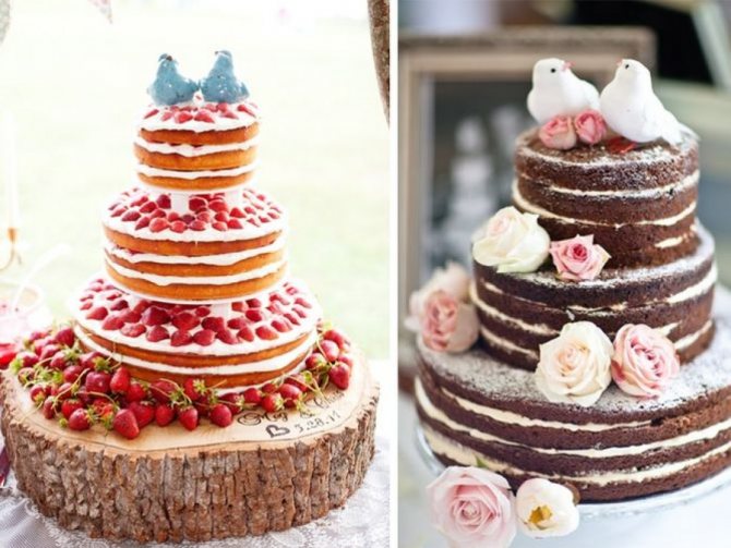 Боковые поверхности не заделывают кремом, поэтому тортик производит впечатление домашнего творения. В 2022 году такой торт становится все более популярным среди новобрачных.