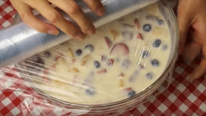 - Накрываем миску пленкой и помещаем в холод на 3 часа.