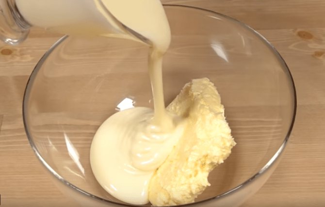 - Масло взбиваем со сгущенным молоком.