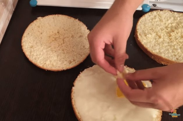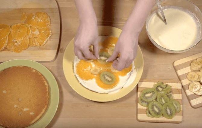 - Смазываем кремом нижний корж, накладываем фрукты.
