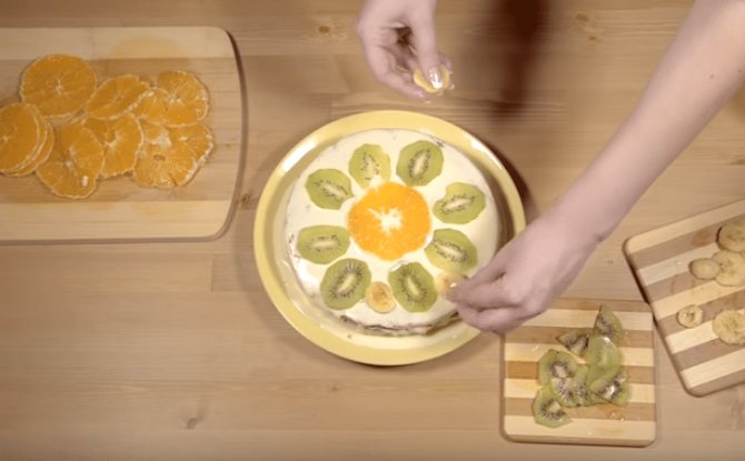 - Смазываем кремом верхний корж и украшаем фруктами.