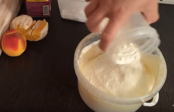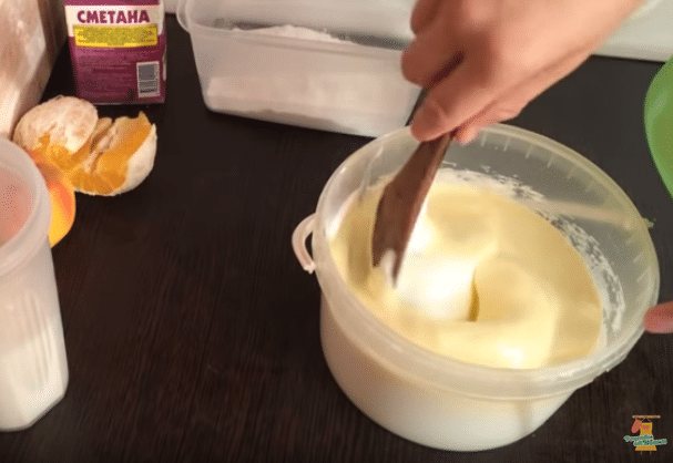 - Сметану перемешиваем венчиком с сахарной пудрой, постепенно добавляя желатин.