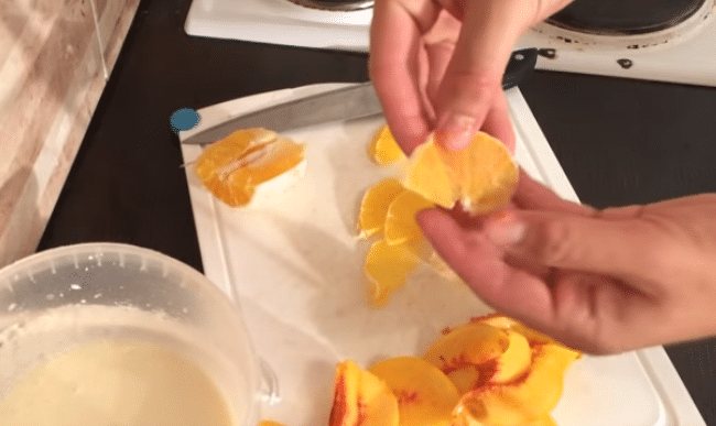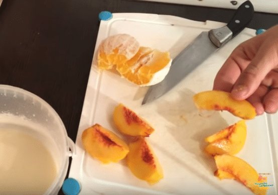 - Очищенный персик режем на дольки.