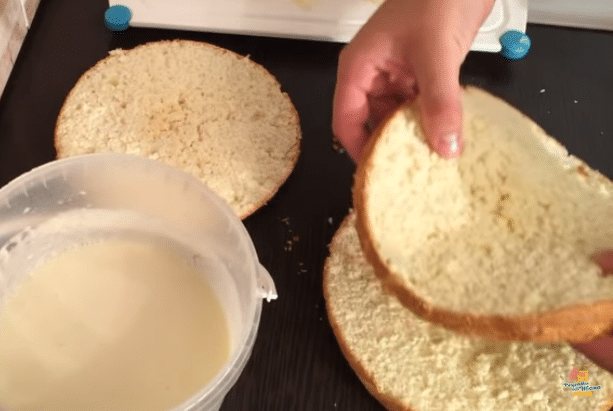 - Бисквит разрезаем на три коржа.