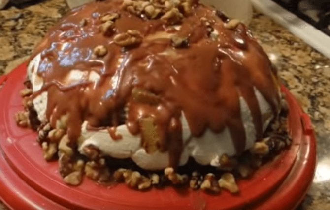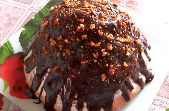 Застывший торт достаем из миски, укладываем на блюдо. Поливаем произвольно шоколадной глазурью. Украшаем орехами.