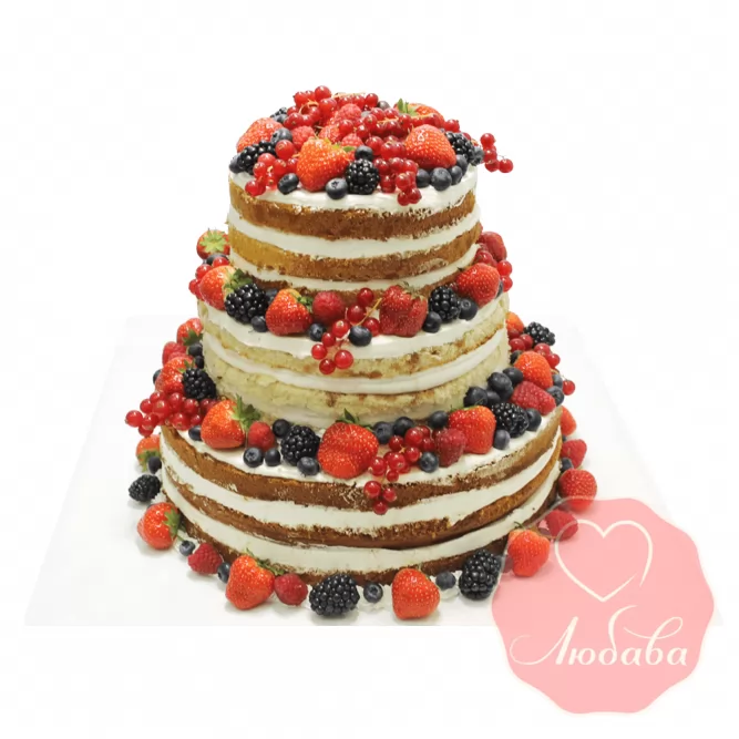 Голый свадебный торт рустик не смазывают по краям, но именно такой способ приготовления позволяет в итоге получить немного небрежный десерт, похожий на горку аппетитных блинов. Коржи смазывают сырным кремом, украшают малиной, черникой, вишнями, голубикой, персиками. Подают главное угощение на подставке из спила дерева.
