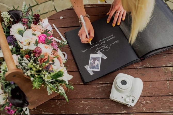 Практически обязательный элемент современной свадьбы. Это может быть альбом для моментальных фото из фотобудки, блокнот в технике «скрапбукинг» или даже большой плакат. Запомните одно простое правило: если вы присутствуете на свадьбе, вы должны оставить свое поздравление в книге пожеланий.
