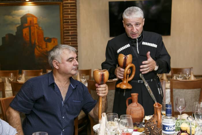 - Тосты поднимаются исключительно со святым напитком — с грузинским вином. Или крепким алкоголем.