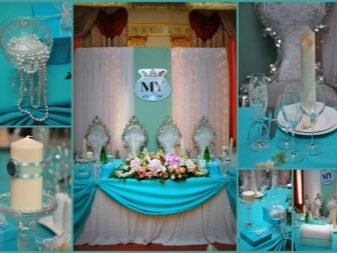 Идея создания свадьбы в стиле «Тиффани» может посетить почитателей творчества Одри Хепберн. Многие девушки без ума от этой актрисы, а также от американской кинематографической классики 60-х «Завтрак у Тиффани». Магазин Tiffany&Co является крупнейшим брендом ювелирных аксессуаров, а также женских и мужских украшений. Их всем известные бирюзовые коробочки зададут свадьбе свой цвет и стиль. Бирюза и белый – вот основные оттенки торжества в стиле американской классики прошлого века.