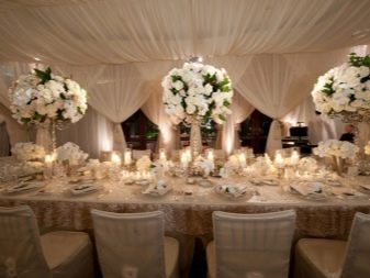 Важно! Не перегружайте стол обилием цветочных гирлянд, за исключением стола молодоженов. Оставьте место для изысканных блюд, украшенных поварами и кондитерами с пользой для приглашенных.