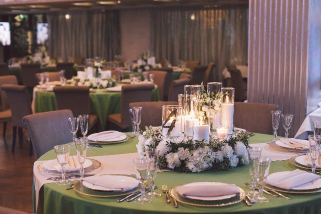 Цвет считается цветом новой жизни. Он хорошо воспринимается глазом и расслабляет. Сочные оттенки этой гаммы смотрятся живо и свежо. Банкетный зал, оформленный в зелёном цвете, надолго запомнится гостям.