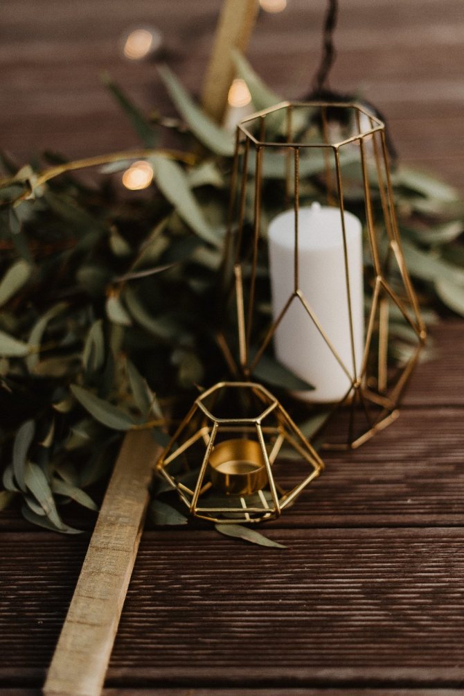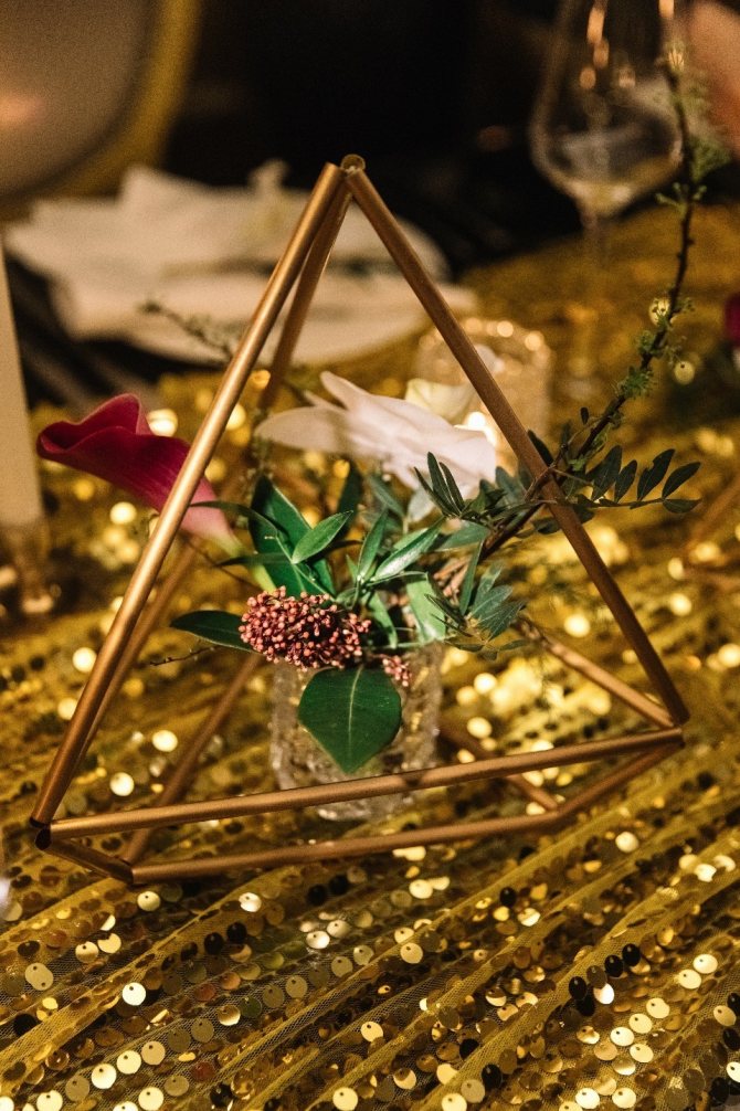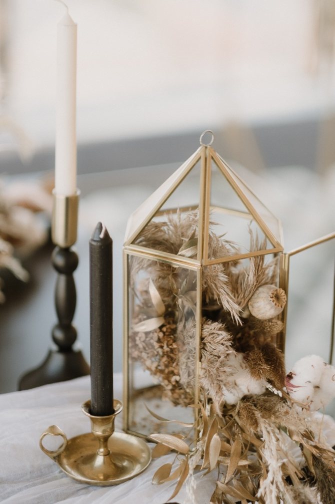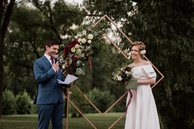 Общая тенденция использовать больше природных материалов в свадебном оформлении сделала популярными металлические детали декора, которые больше не ограничены стилистикой лофт или убран. Цвет металла может быть любой, но теплые оттенки меди и розового золота — явные фавориты в новом сезоне.